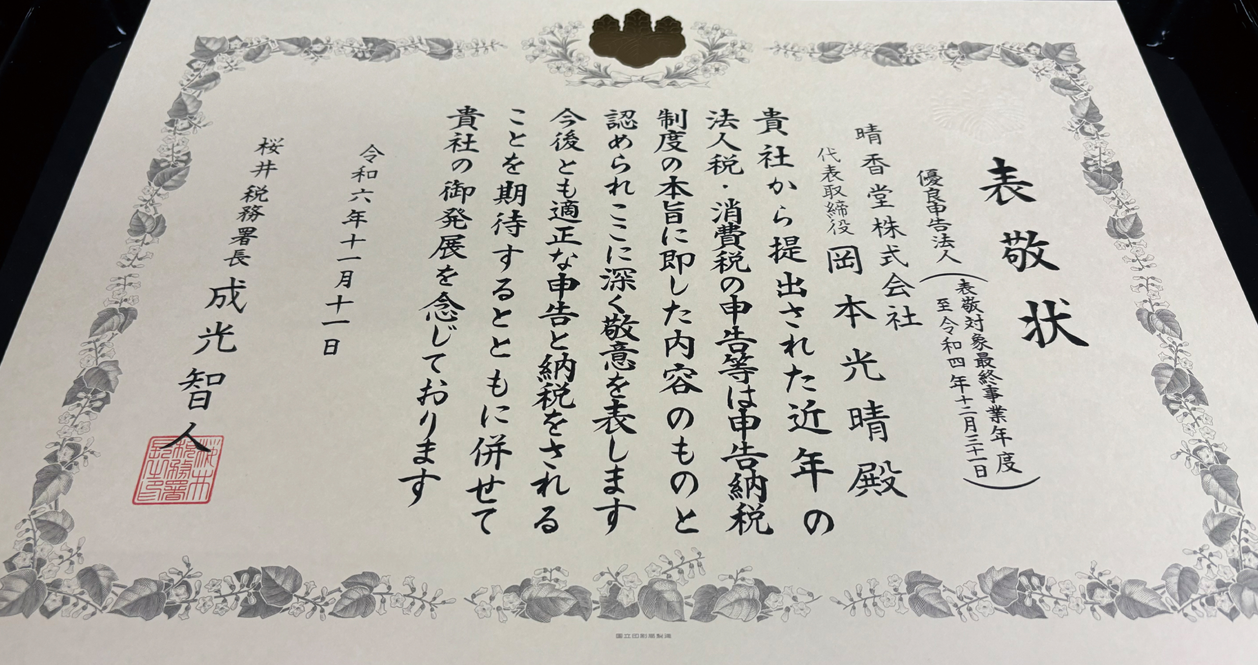 令和6年11月11日(月)に桜井税務署より、納税表彰をいただきました。 弊社の納税姿勢を始めとした取り組みをご評価頂いたものと深く感謝いたします。 今後も法人税・消費税の適正な申告をすることで、微力ながら社会貢献に努めてまいります。 今後とも晴香堂株式会社をよろしくお願い申し上げます。